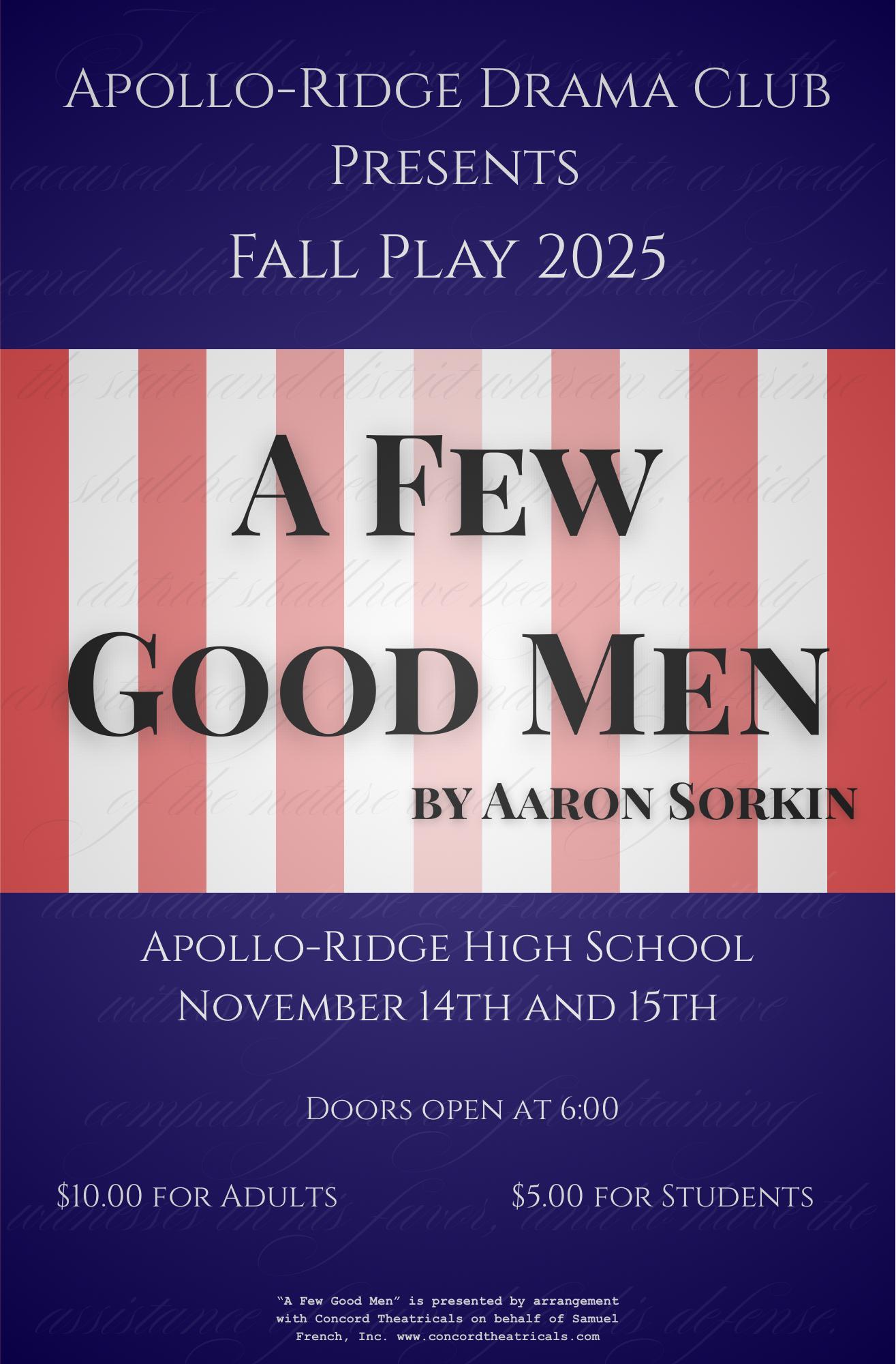 The ARHS/ARMS fall play will be "A Few Good Men". Shows will be November 14th and 15th beginning at 7:00pm (Doors opening at 6:00pm). Adult tickets will be $10 and student tickets will be $5 (Cash or Check only). Come out and see a fantastic show!!!!