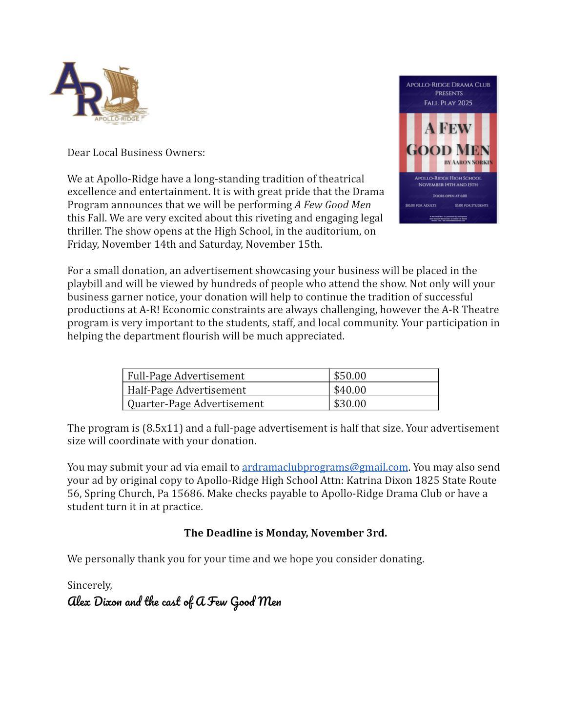 Drama Club Sponsorship Looking to sponsor the ARHS/ARMS Drama Club? Click the letter to read about how you can sponsor and support our drama club! #VikingPRIDE Published October 27, 2025 Print
