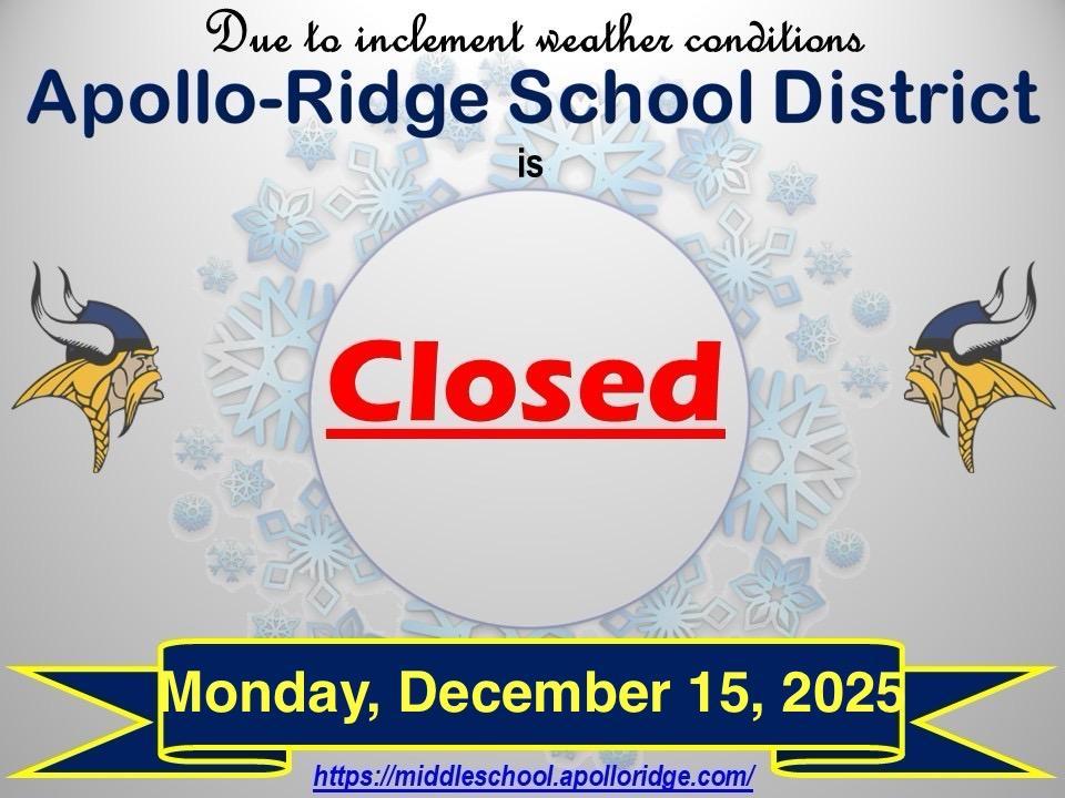UPDATE: Due to continued hazardous conditions in our outlying areas, the Apollo-Ridge School District will be closed Monday, December 15, 2025. We will utilize a built in snow make-up day later in the school year. Stay safe!