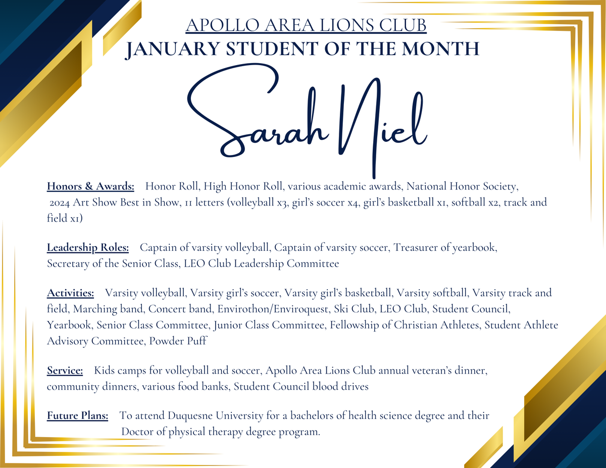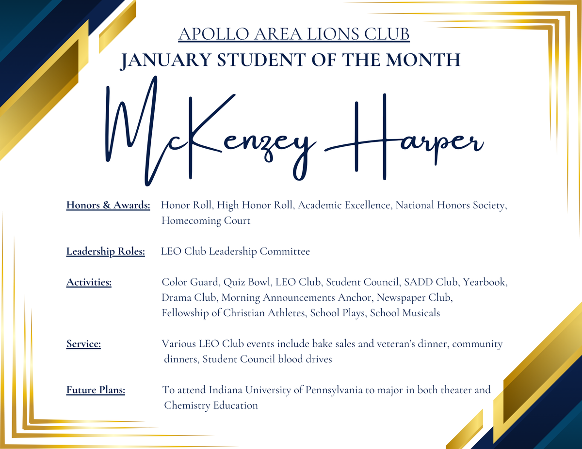 Apollo-Ridge High School is proud to recognize McKenzey Harper and Sarah Niel as the Lions Club Students of the Month for the month of JANUARY because of their outstanding leadership, academic achievement, and commitment to serving others.