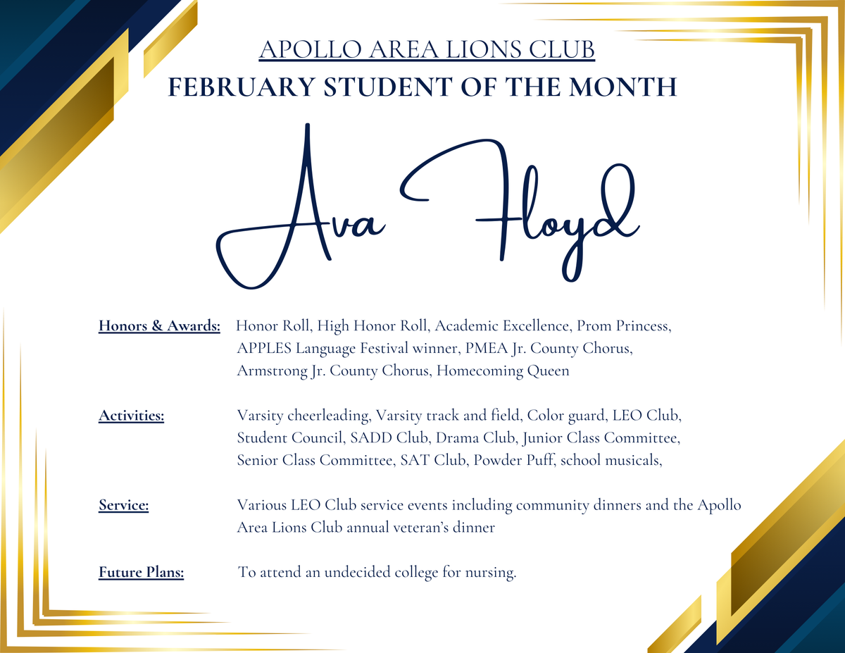 Apollo-Ridge High School is proud to recognize Ava Floyd and Gabriella Cotter as the Lions Club Students of the Month for the month of FEBRUARY because of their outstanding leadership, academic achievement, and commitment to serving others.