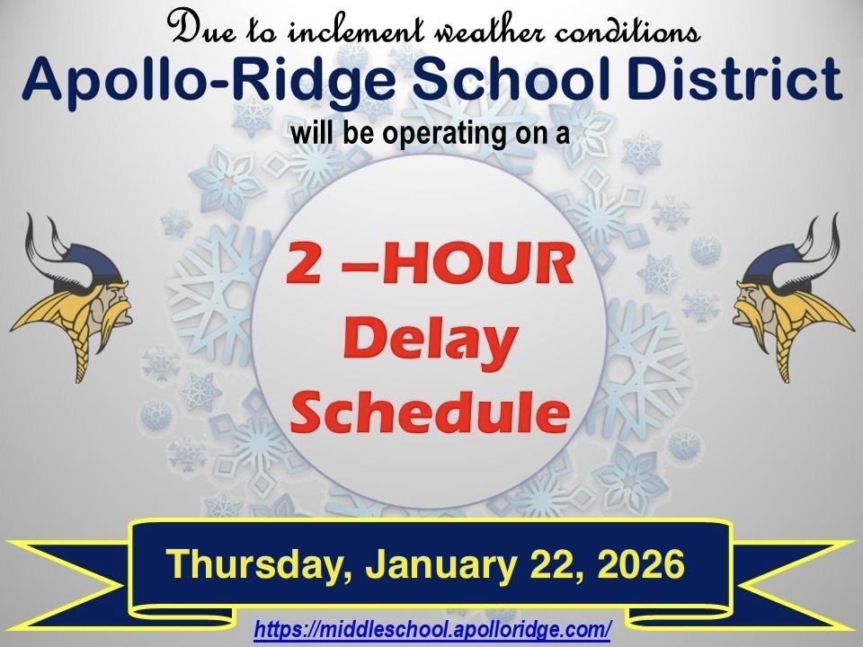 Due to hazardous road conditions, the Apollo-Ridge School District will operate on a 2 Hour Delay Schedule for Thursday, January 22, 2026. The 2 Hour Delay Schedule can be found on the Middle School/High School Website or by clicking here: https://middleschool.apolloridge.com/apps/bell_schedules/