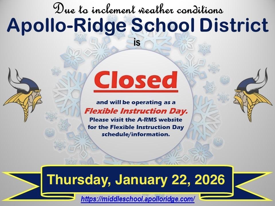 Due to continued hazardous weather conditions, the Apollo-Ridge School District will be closed on Thursday, January 22, 2026.