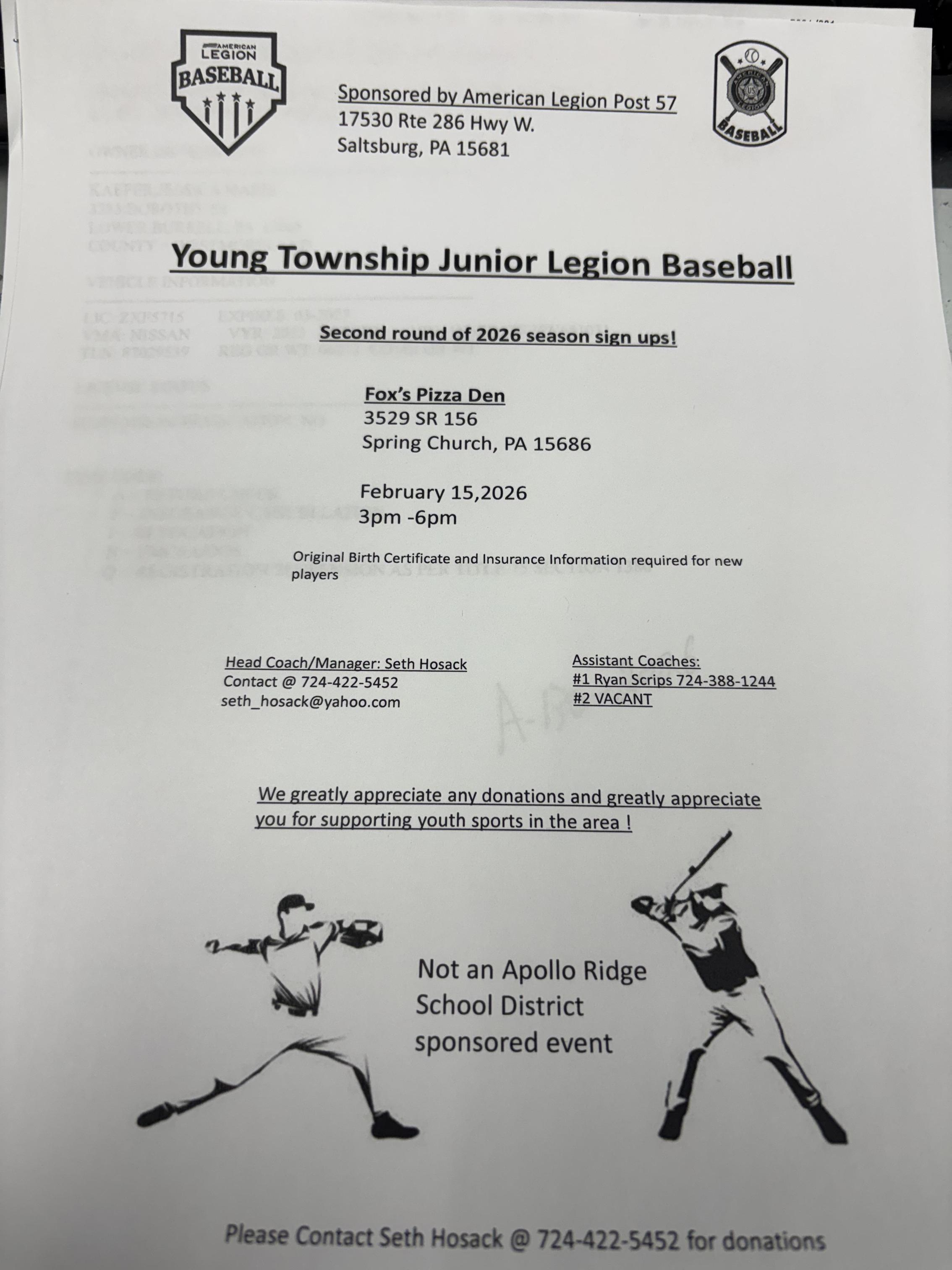 Young Township Junior Legion Baseball Signups Check out the flyer for information on Young Township Junior Legion Baseball Signups on February 15, 2026. Published January 30, 2026 Print