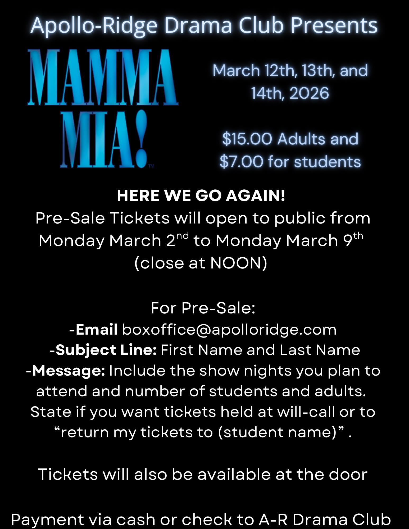 Mamma Mia Pre-Sale Tickets Check out the attached information for Pre-Sale Tickets for Mamma Mia!!! Attached Files Tickets Forms.pdf Published March 2, 2026 Print