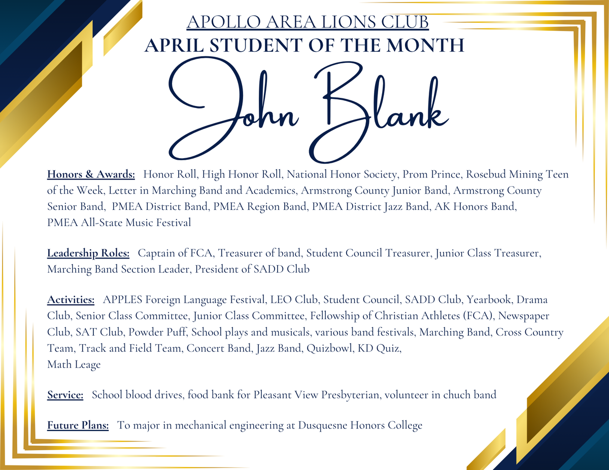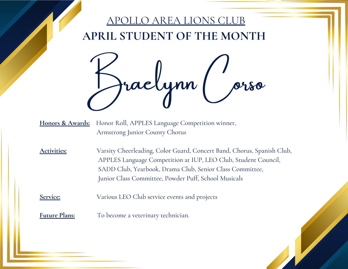 Apollo-Ridge High School is proud to recognize Braelynn Corso and John Blank as the Lions Club Students of the Month for the month of APRIL because of their outstanding leadership, academic achievement, and commitment to serving others.